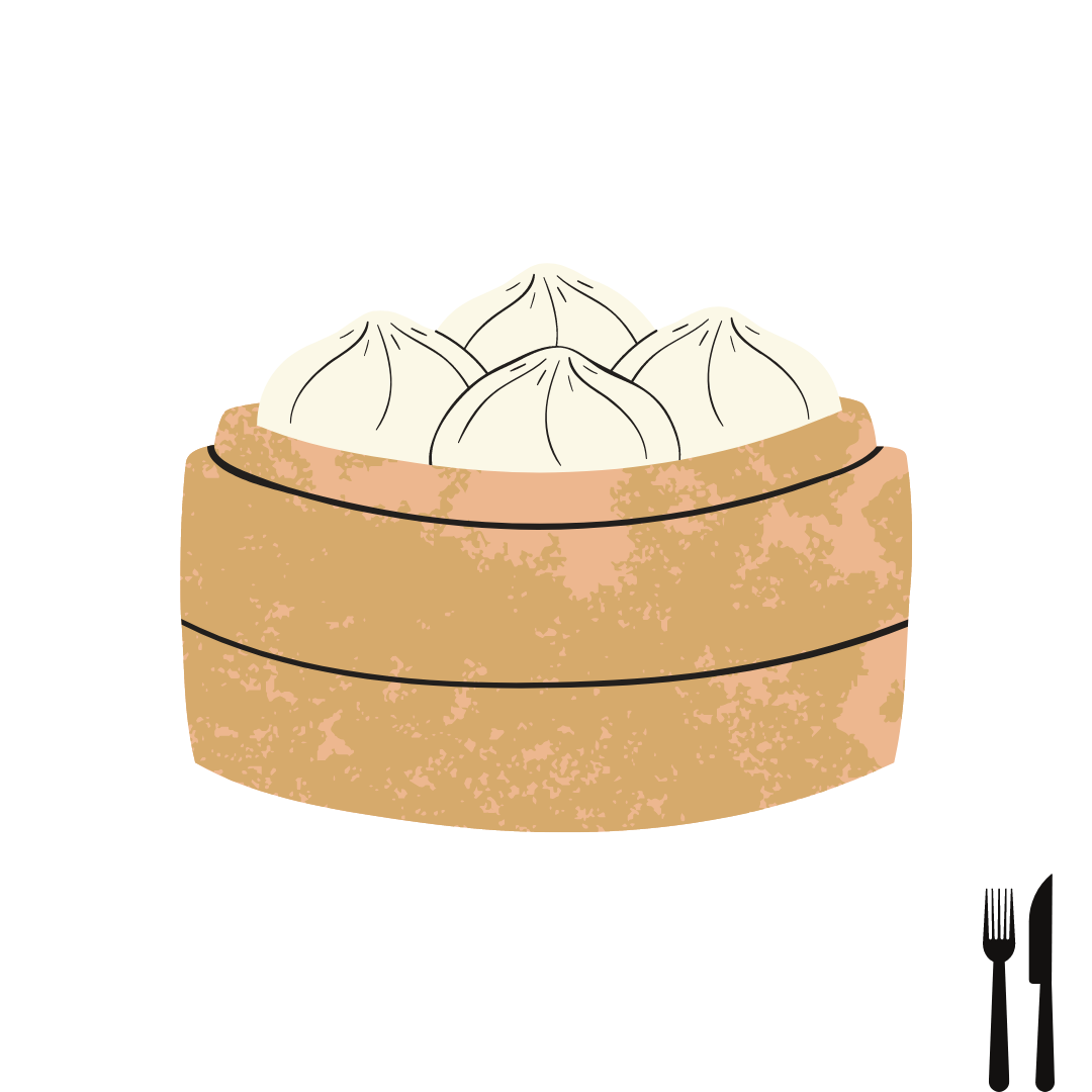 a cartoon image of dumplings in a round container with a fork and a knife in the bottom corner