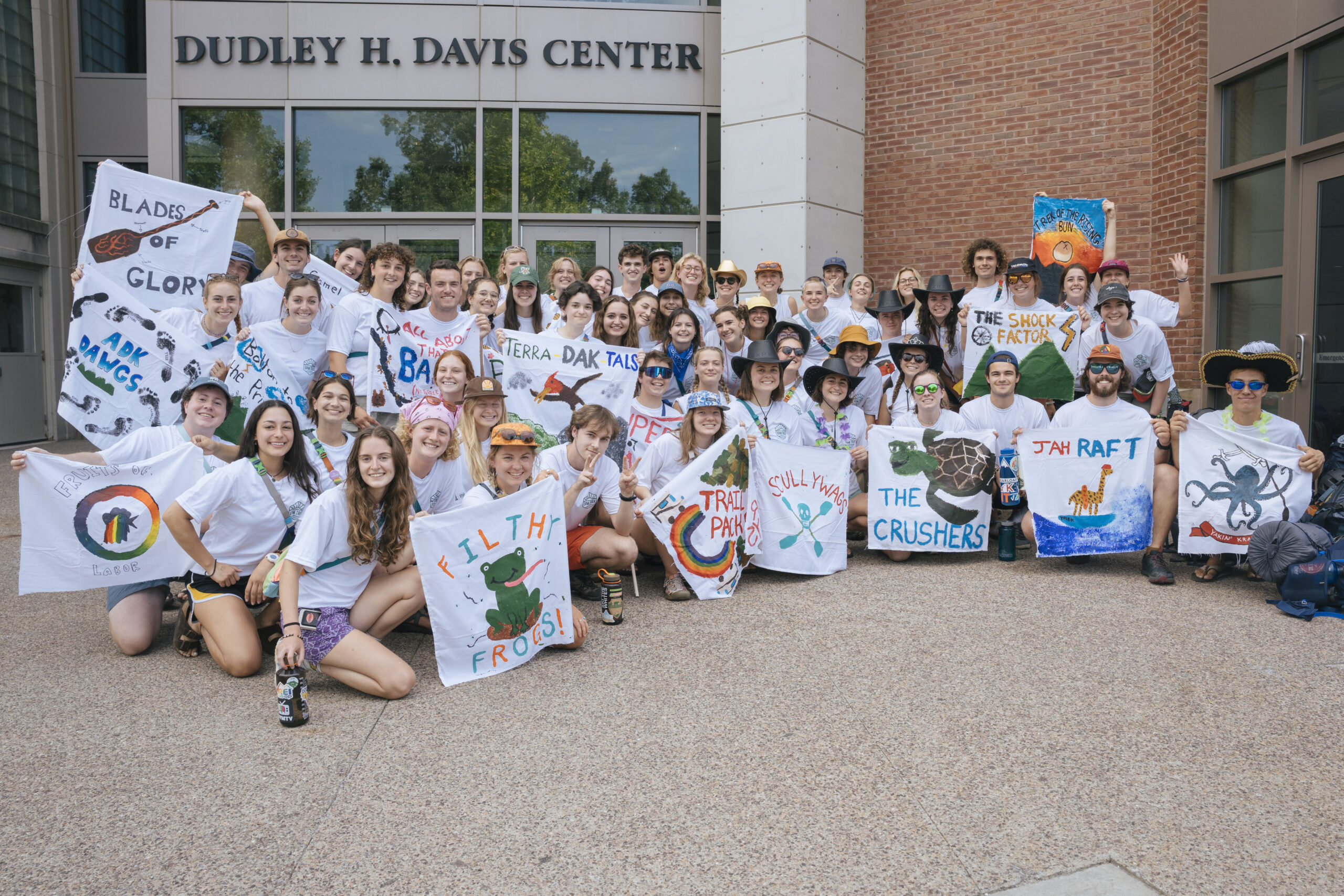 TREK Leaders gathered in front of the Davis Center, smiling and holding up signs for their TREK groups.