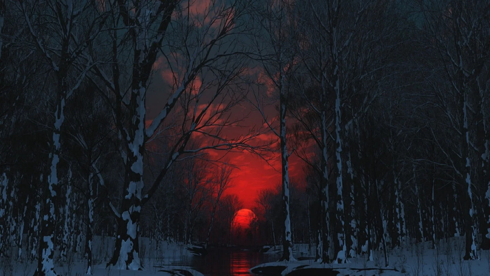 a red sun in a dark forest