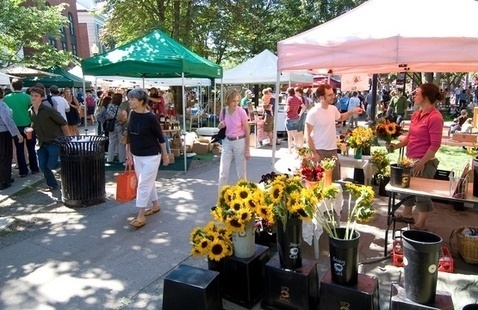 Patrons explore the Burlington Farmer's Market, perusing booths with produce, flowers, food and handmade art.