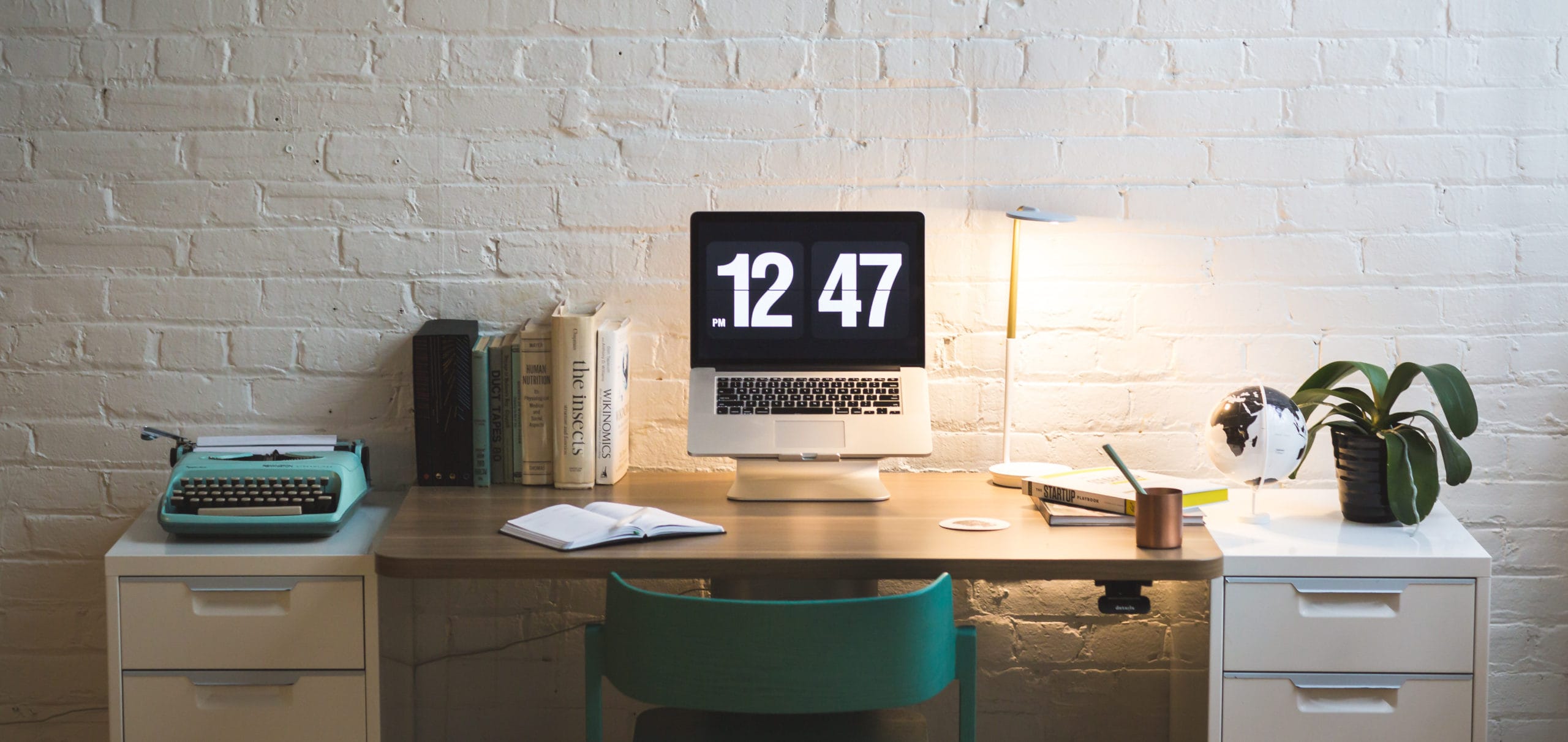 a mac on a clean desk against a brick wall